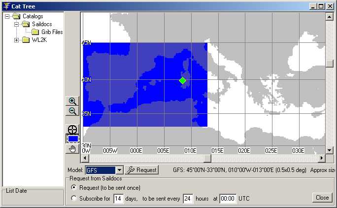 Mit PACTOR III kann man also größere Grib-Files mit größeren Planquadraten bzw. mit kleinerem Gitterpunkt-Abstand übertragen. Mit PACTOR II muss man sich mit kleineren Planquadraten bzw. mit größerem Gitterpunkt-Abstand begnügen, damit die Übertragung nicht zu lange dauert. Schritt 2: Planquadrat Jetzt legen Sie das Planquadrat fest, für das Sie Wetterdaten anfordern wollen. Unter "Window / Catalogs" finden Sie einen Ordner "Saildocs" und darin den Ordner "Grib Files". Wenn Sie "Grib Files" anklicken, öffnet sich eine zunächst leere Weltkarte. Am linken Rand befindet sich eine Leiste mit Buttons: