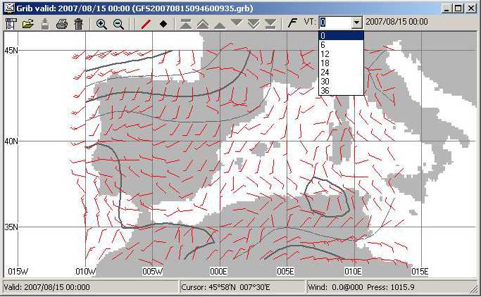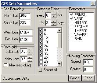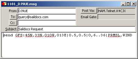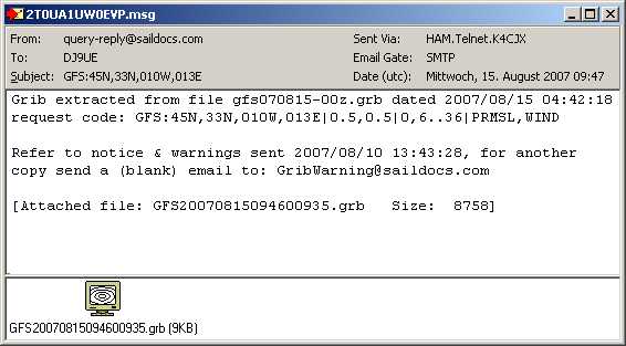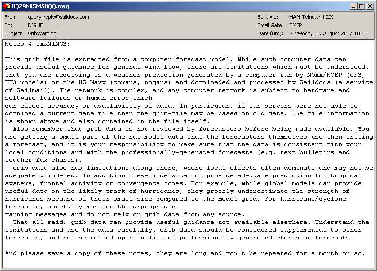 delta-Lat 0.5 und delta-Lon 0.5 (kurz 0.5 x 0.5) bedeuten einen Abstand der Gitterpunkte von 30 Seemeilen. (1 x 1) bedeutet doppelten Abstand der Gitterpunkte, also 60 Seemeilen.Unter Forecast Times stellen Sie die Prognose-Zeit ein.Unter Parameters stellen Sie ein, welche Daten das Grib-File enthalten soll. Im Bild oben wurden Bodendruck und Windstärke ausgewählt. Je geringer die Maschenweite, je geringer die Zeitintervalle, je länger der Prognosezeitraum und je mehr ausgewählte Parameter, umso größer wird die angeforderte Datei. Wenn Sie mit dem Boot Strecke machen, interessiert Sie natürlich nicht der Wind in 24 Stunden an Ihrem momentanen Ort, sondern vielmehr an dem Ort, an dem Sie in 24 Stunden sein werden. Dafür geben Sie unter Moving Forecast Ihre Geschwindigkeit (Speed) und Ihren Kurs (Course) an.Schritt 4: Absenden des Grib-Request Wenn Sie jetzt auf den Button "Sent" klicken, wird automatisch eine Request-Message erstellt, die Sie absendebereit in der Outbox finden und die etwa wie folgt aussieht: (eventuell zusammen mit der oben beschriebenen Options-Message).Schritt 5: Empfang und Auswertung des Grib-File Beim nächsten Connect (frühestens ca. 5 Minuten nach dem Request) bekommen Sie eine Mail, die als Attachment das Grib-File enthält: (bzw. der Kartenausschnitt, den Sie oben gewählt haben) diesmal nicht leer, sondern mit den angeforderten Daten: Das Pull-Down-Menu oben ermöglicht die Auswahl des gewünschten Zeitpunktes. Einfacher ist es, nach Klick auf eikne Zeit das Maus-Rad zu drehen, dann sehen Sie quasi einen Film...Wenn Sie zum ersten Mal ein Grib-File anfordern, erhalten Sie eine Warn-Mail, in der auf mögliche Fehler hingewiesen wird, und die zu vorsichtigem Umgang mit Grib-Files mahnt: